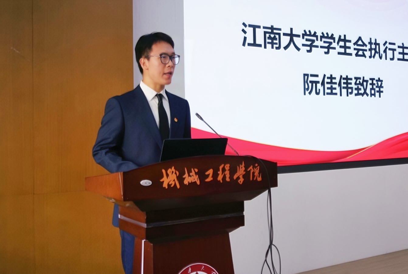 开幕式在庄严的国歌声中拉开帷幕。本次大会收到了来自马克思主义学院、智能制造学院、环境与生态学院等多个兄弟学院学生会、研究生会发来的贺信。江南大学学生会执行主席阮佳伟也代表校学生会向大会召开表示祝贺并致辞。