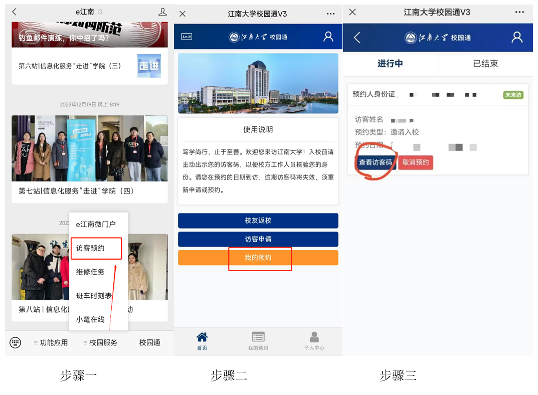 手机关注“e江南”微信公众号,点击屏幕下方“校园服务”中的“访客预约”,进入后点击“我的预约”,点击“查看访客码”即可获得访客码。进入校园时出示访客码。